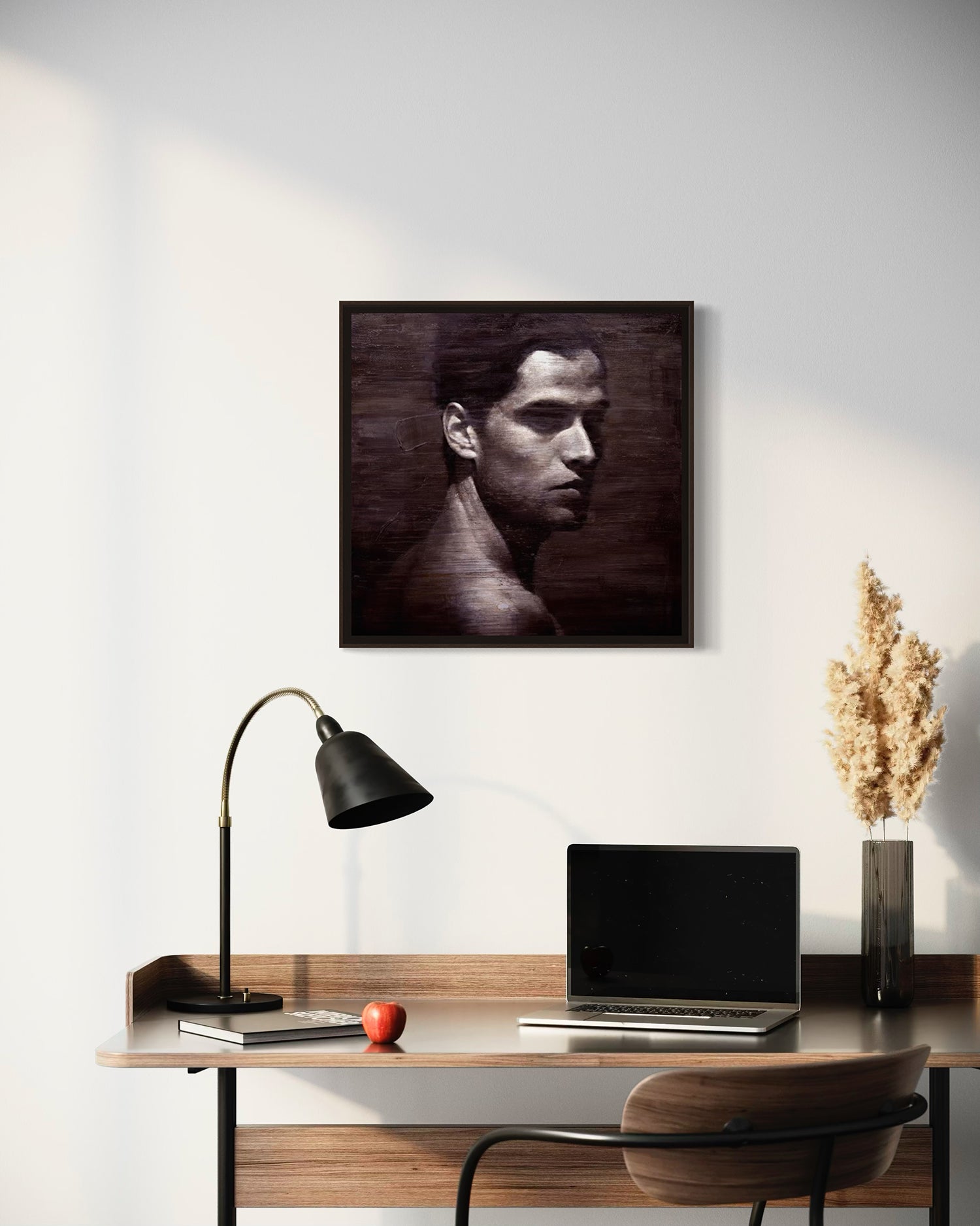 The solid oak frame, tinted by hand with Osmo oil, reveals the natural grain and warmth of the wood, framing the work with quiet sophistication.